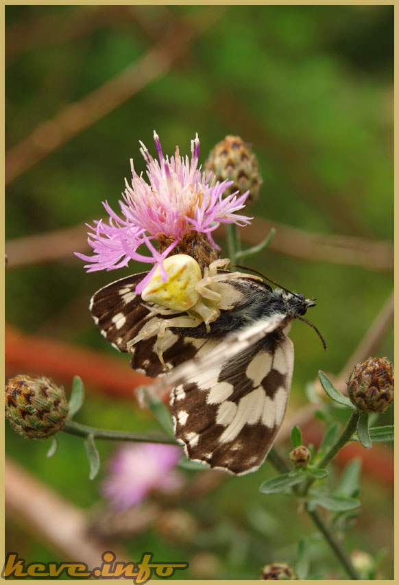 Eddig még nem sikerült igazi "természetfotót" készítenem, de ami késik, nem múlik! Sikerült megörökítenem, ahogy egy sárga pók elkap egy pillangót, és elmajszolja.