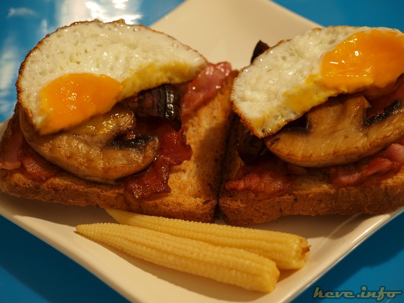 Rozskenyérből készítettem pirítóst, egy kávéskanálnyi worchester szószt elkevertem egy evőkanálnyi majonézzel, és a pirítós közepére kanalaztam. A bacon szalonnát megpirítottam, és a kenyérszeletre helyeztem. A szalonnából kisült zsírban megpirítottam az ujjnyi vastagra vágott gombafejeket, és egy szelet padlizsánt. A tetejére tükörtojást tettem.