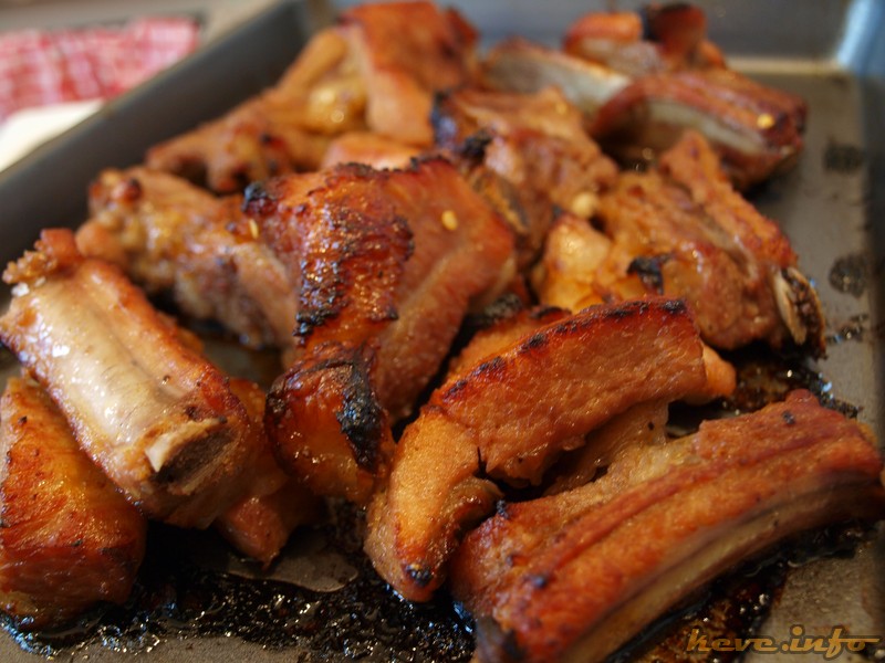 Először megfőztem az oldalast sós, babérleveles vízbe, majd készítettem szójaszószból-, narancsléből-, citromléből-, mézből-, olívaolajból-, és csiliszószból pácot, és a kihűlt oldalasokat bepácoltam vele 1/2 órára. Utána sütőbe tettem, és megvártam, míg a méz rákaramelizálódott a húsra!