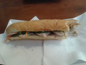 Hamarosan megérkezett a szendvics is! Rávetettük magunkat, mint farkasok a nyúlra! 🙂 A szendvics alapanyaga a bagett nagyon jó volt ,ropogós, belül omlós, kellemes ízű. A vietnami sonka engem egy sűrűbb májkrémre emlékeztetett, de ettől függetlenül nagyon finom volt! Volt még benne koriander-, savanyúságra emlékeztető  répacsíkok-, uborka-, gyömbér-, és egy speciális öntet, ami időnként curry -re emlékeztetett, időnként meg nem. 😀  Tökéletes volt, biztos, hogy ki fogjuk próbálni a vietnami húsos verziót is! 🙂