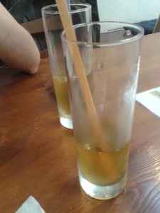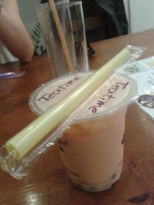Végül megérkezett a buborék tea is. Külön meglepetés volt, hogy két pohárral kaptunk (újabb jó pont a bisztrónak!), mert a szendvicsből nem kaphattuk meg az ígértet!
